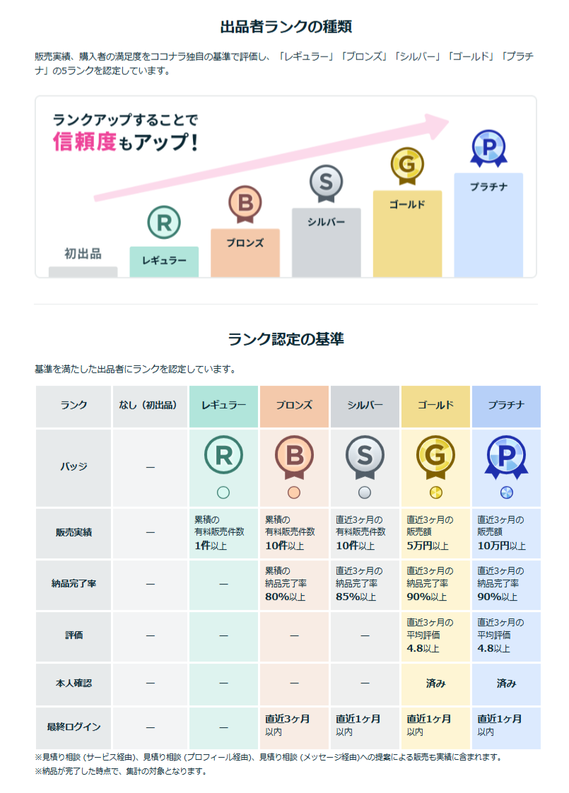 プラチナ:直近3ヶ月 販売額10万円以上 + 本人確認済み + 直近3ヶ月平均評価4.8以上(目安)