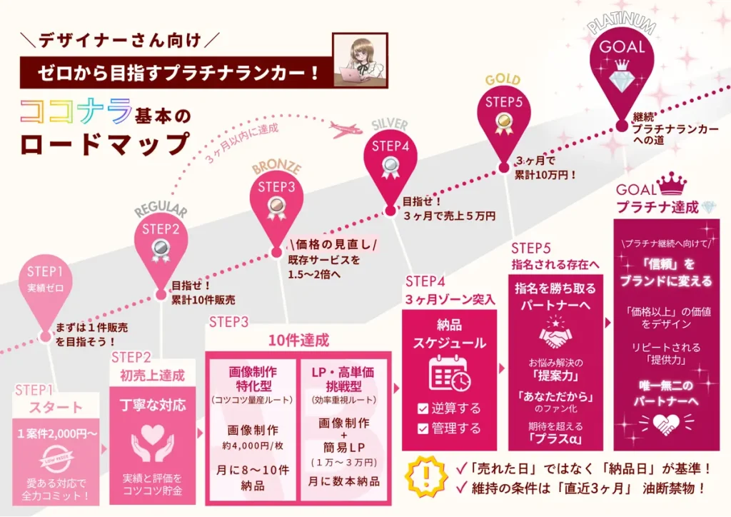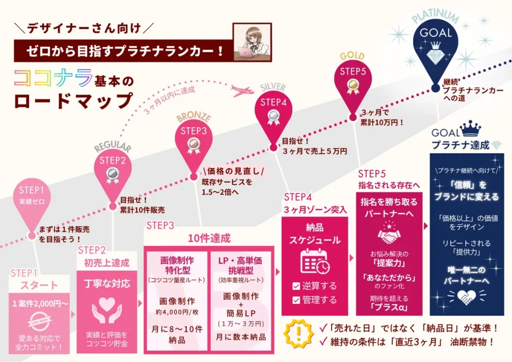 【デザイナーさん向け/ ゼロから目指すプラチナランカー! 〜ココナラ基本のロードマップ】の図解イラスト