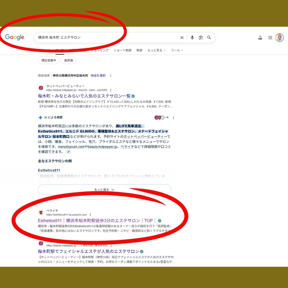 「横浜市 桜木町 エステサロン」という検索キーワードで、たくさんの検索結果の中からGoogleの1ページ目に表示されています。この成果は、ペライチのシングルページで実現したものなんです!
